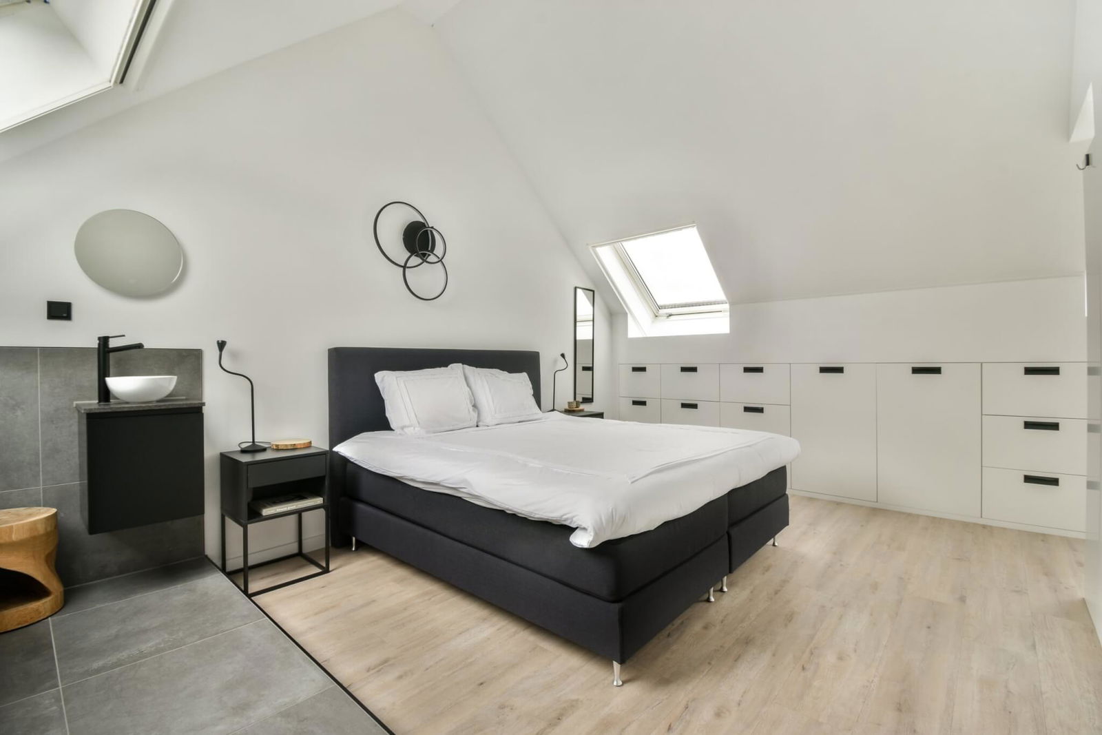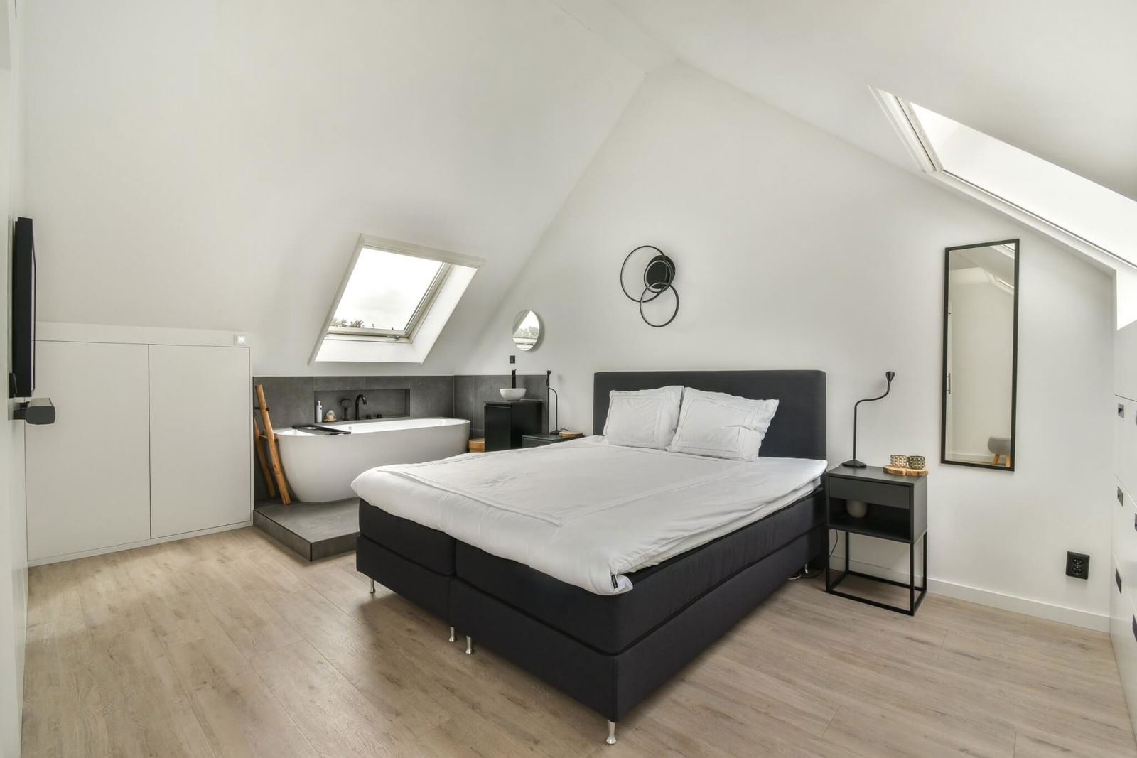 Een royale slaapkamer met de uitstraling van een hotelkamer. Hier treft u een vrijstaand ligbad, wastafel en een prachtige op maat gemaakte kastenwand. De opstelling voor wasmachine/droger is netjes weggewerkt in een op maat gemaakte inbouwkast.